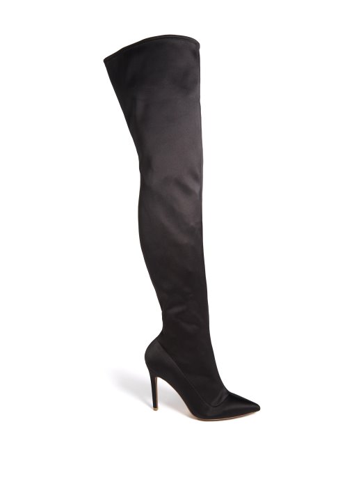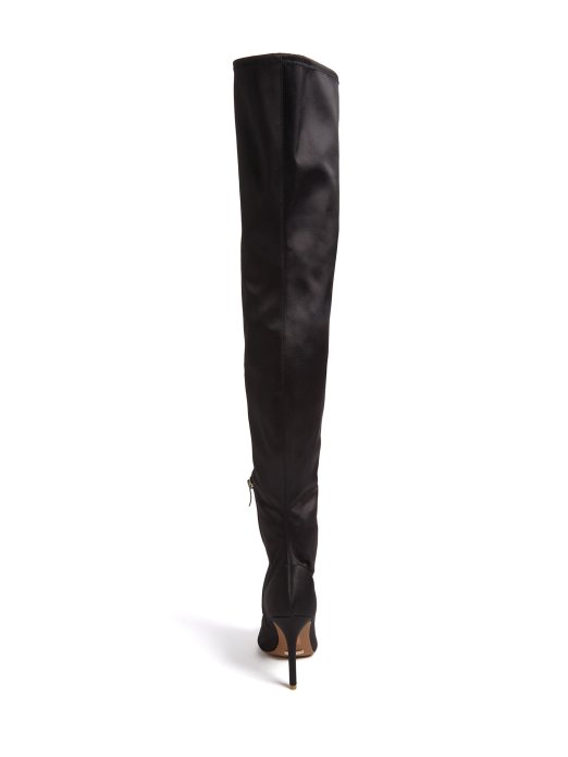 Nebeski Visok I Veličanstven. Ova čizma Od Mekane Likre I Rastezljivog Satena Koja Prelazi Preko Koljena Ima šiljati Vrh I Stiletto Petu.