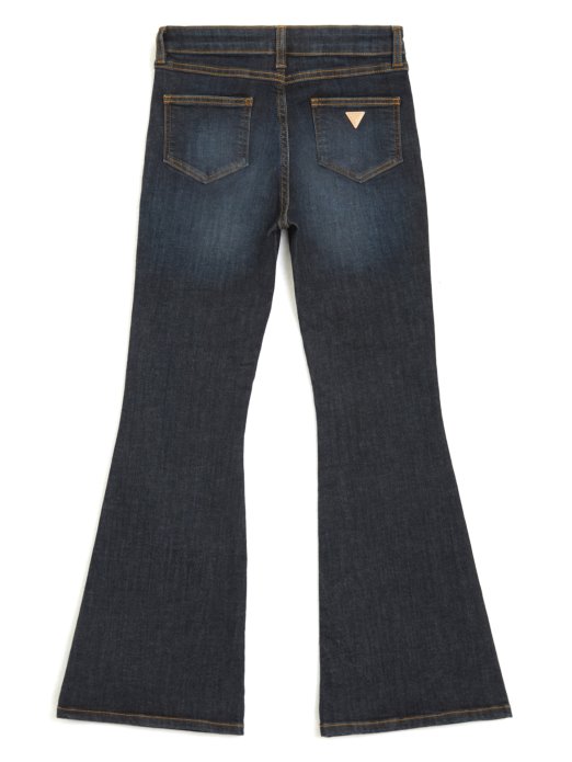 Udoban Par Traper Hlača Za Nju. Tamno Isprane Traperice Od Vrhunske Rastezljive Tkanine Imaju Proširene Nogavice, Namjerno Izblijedjele, Brkove, Dizajn S četiri Džepa I Zatvarač S Patentnim Zatvaračem.