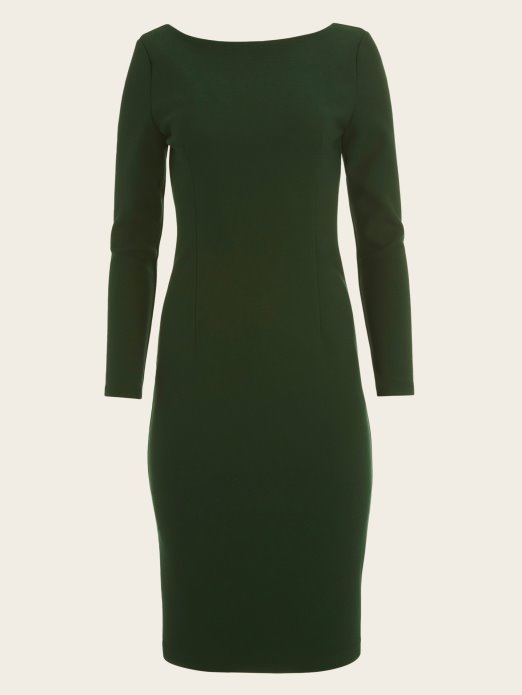 Elegantna Sofisticiranost Stvorena Da Impresionira. Ova Pripijena Haljina Ima Sjajni Stražnji Patentni Zatvarač S Dvostrukom Funkcijom, V-leđa, Brodski Izrez, Duge Rukave I Suknju Inspiriranu Olovkom.
