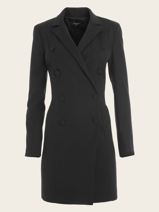 Prijeđite S Radnog Stola Na Večeru S Ovom Moćnom Haljinom. Dizajniran Od Umjetne Krokodilske Kože, Oštrih Podstavljenih Rukava, širokog Dvostrukog Revera, Velikog Kopčanja Sprijeda I Patentnim Zatvaračem Straga.