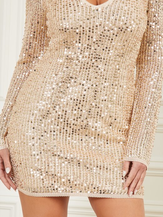 Zablistajte Cijelu Noć U Ovoj Mini Haljini Dugih Rukava Izrađenoj Od Pletiva Prekrivenog Glamuroznim šljokicama S V-izrezom. Navlači Se.