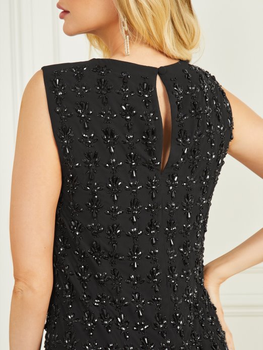 Dodajte Ovaj Blještavi Lbd U Svoj Katalog Blagdanske Glamurozne Odjeće. Haljina Od žoržeta Sa Svjetlucavim Monokromatskim Perlama, Visokim Dekolteom, Krojem Bez Rukava I Kopčanjem Na Stražnju Stranu.