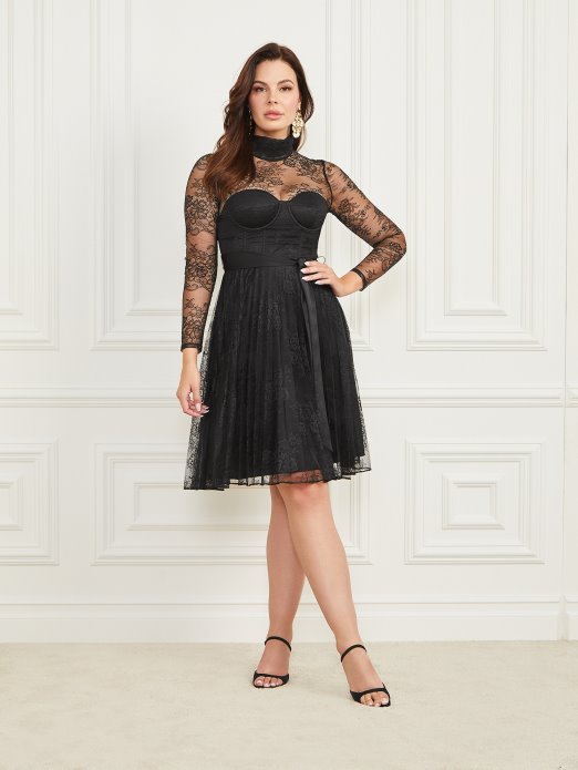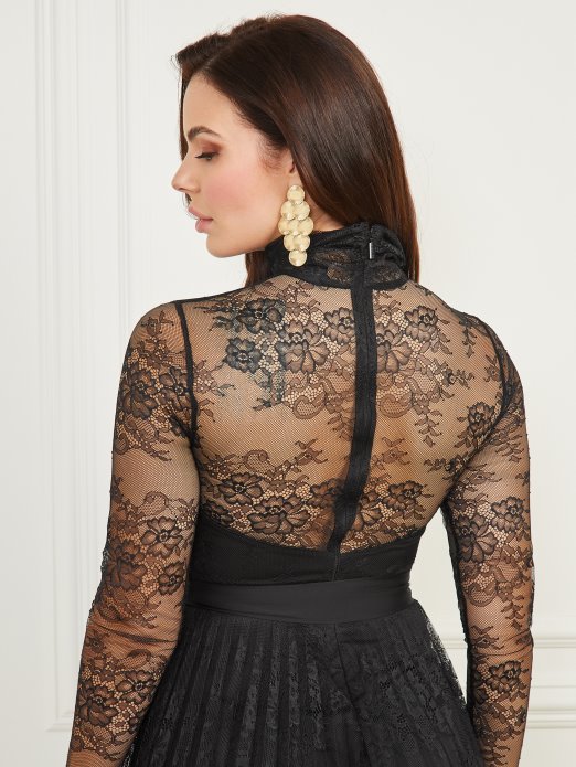 Uljepšajte Prostoriju Elegantnim Ulazom U Ovoj Prekrasnoj Haljini Koja Sadrži Izvezenu čipkastu Kompoziciju S Prozirnim Dugim Rukavima I Lažnim Ovratnikom. Stiliziran S Podstavljenim Izrezom U Obliku Srca, Trakastim Pojasom Oko Struka I Patentnim Zatvaračem Na Leđima.