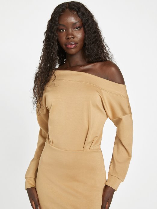 Instant Klasik Ormara, Ova Haljina Dizajnirana Je Od Mekog Pletiva I Ima Dekolte S Otvorenim Ramenima, Duge Rukave I Pripijenu Suknju.