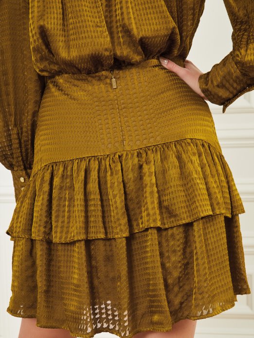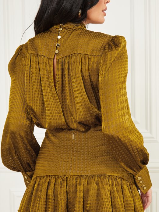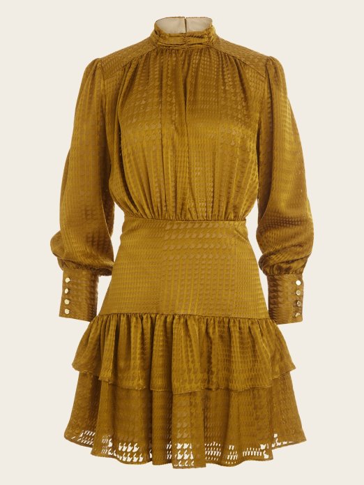 Pređite Iz Ureda Na Večeru S Ovom Zadivljujućom Haljinom. S Prozirnim Printom, Naboranim Rubom, Lažnim Ovratnikom, Detaljima S Prorezom Na Leđima, Zvonastim Rukavima I Rubovima Na Ramenima.