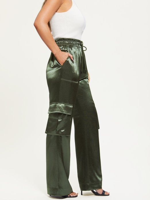 Izrađene Od Fluidne, Sjajne Izrade, Ove Svilene Kargo Hlače Stilski Se Ističu. Imaju Super Visoki Kroj, Lepršave Ravne Nogavice I Elastični Pojas S Vezicama.