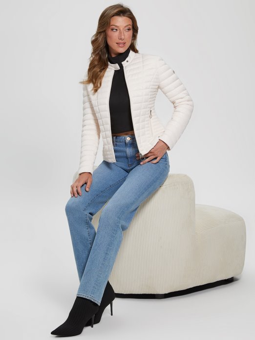 Dodajte Više Sloja Svom Izgledu S Ovom Prošivenom Najlonskom Jaknom S Uzorkom Logotipa, Samostojećim Ovratnikom, Bočnim Džepovima I O-prstenastim Patentnim Zatvaračem Ukrašenim Draguljima.