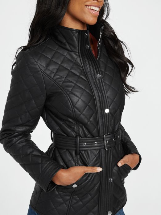 Ova Strukturirana Jakna Od Umjetne Kože Ima Prošiven Dizajn Sa Samostojećim Ovratnikom, Uključenim Remenom U Struku I Bočnim Džepovima. Zajedno S Patentnim Zatvaračem I Zatvaranjem Na Gumb.