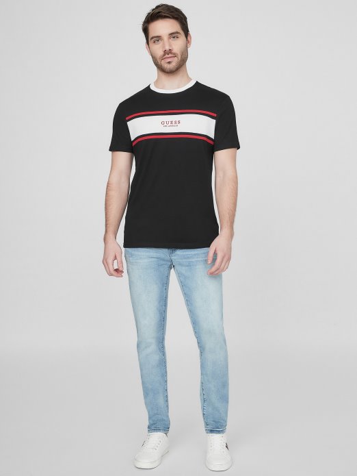 Kontrastne Središnje Pruge I Okrugli Izrez čine Ovu Majicu Od žerseja Popularnom. Prednji Logo.