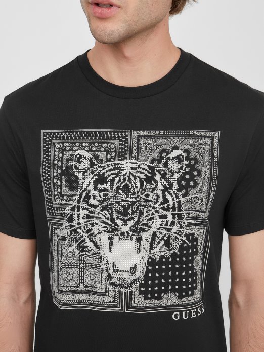 žestoko Obucite Ovu Majicu Od Džersija S Tigrom Ukrašenim Kamenčićima I četvrtastim Printom šala, Okruglim Izrezom I Kratkim Rukavima. Koristi Organska Pamučna Vlakna.