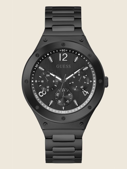 Napravljen Za Rad U Uredu I Izvan Njega, Ovaj Sat Od Uglačanog Crnog čelika Dizajniran Je S Delikatnim Vijčanim Detaljima Oko Okvira I Crnim Kućištem S Brojčanim Oznakama 12, 4 I 8 I Monokromatskim Pomoćnim Brojčanicima. Završena Narukvicom Od Poveznice.