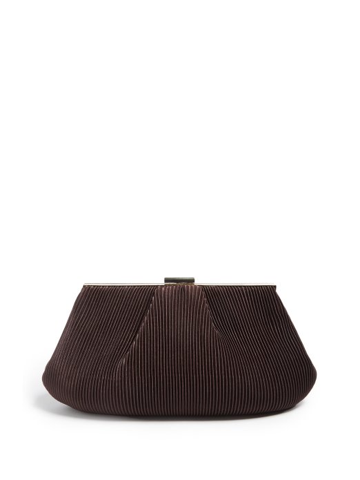 High-class from day to night. This pleated satin pouch features gold-tone hardware with a snap closure and an optional chain-link chain.