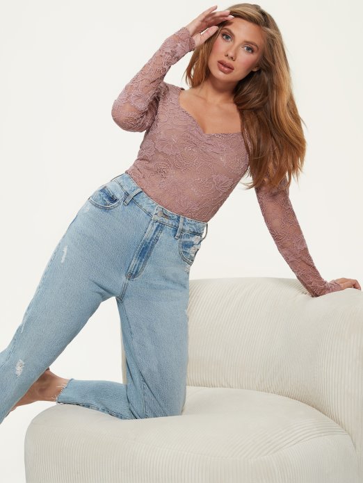 ženstveni Favorit, Ovaj čipkasti Top Ima Izrez U Obliku Srca, Podstavljenu Prednju Stranu I Prozirne Duge Rukave I Stražnju Stranu.