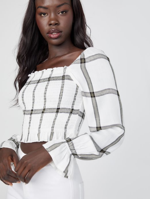 Novi Favorit Za Kojim Možete Posegnuti, Ovaj Top Ima Smokirano Tijelo S Ravnim Izrezom I Dugim Rukavima S Napuhanim Rukavima I Nabranim Manšetama.