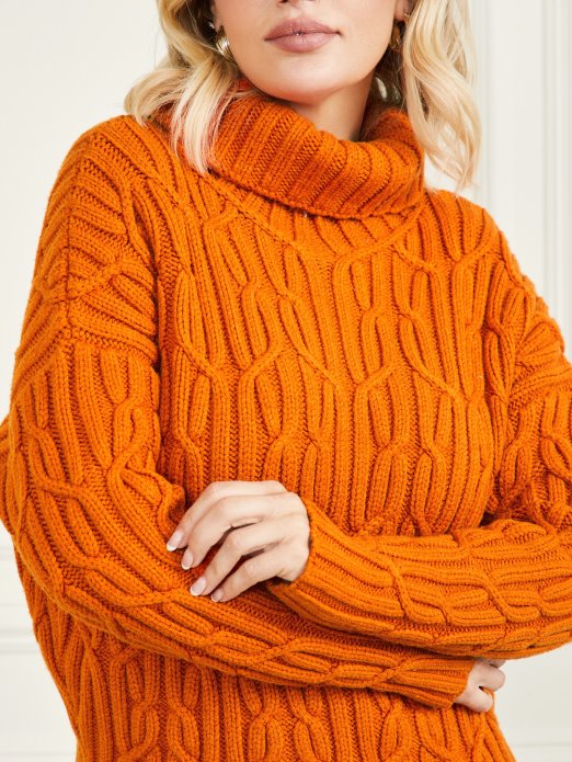 Ugodna Izrada. Ovaj Robusni Pleteni Džemper Ima Kabelski Dizajn, Plišanu Dolčevitu I Duge Dolman Rukave.